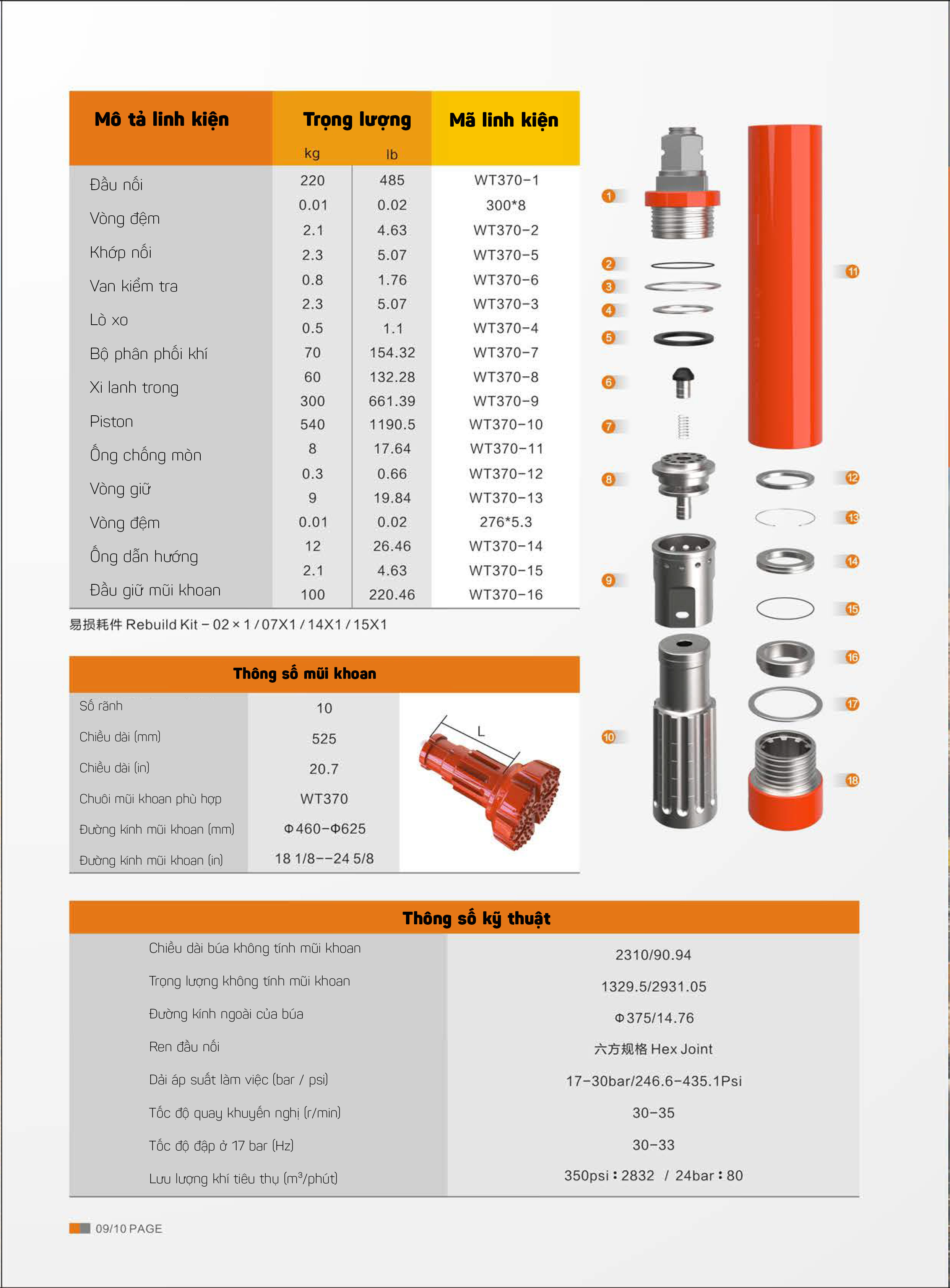 Búa WT370 (Fastest DTH Hammer) là dòng máy khoan áp suất cao được thiết kế linh hoạt, tương thích với nhiều kiểu trục (shaft) tiêu chuẩn và kích cỡ búa khác nhau. Cho dù ứng dụng của bạn là gì, sản phẩm này cung cấp giải pháp phù hợp để tăng hiệu suất khoan đá và giảm chi phí vận hành.